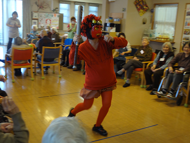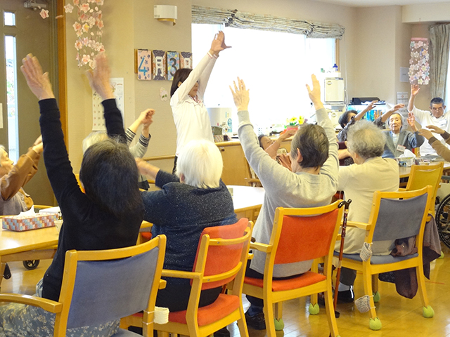 | 14:00 | レクリエーション | 利用者全員で行う合同レクリエーションです。2~4種類の内容からやりたいものを選ぶ選択レクもあります。ときには、ボランティアさんをお招きして、ダンスや音楽を楽しむことも。内容によって、来る日を変えることもできます。(クリックで写真が拡大します) |