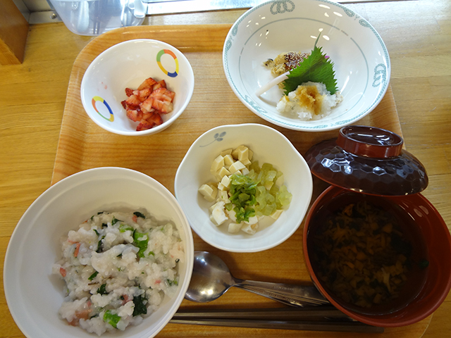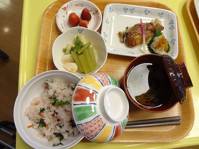| 12:00 | 昼食 | 「地産地消」をモットーに、自家厨房で作った美味しい食事をお出しします。食事は、体調に合わせて形態を変えることができます(一般食・きざみ食)。(クリックで写真が拡大します) |